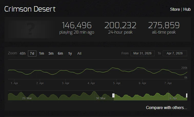 Crimson Desert peaked at 275K players and at the time of this writing, weeks after its launch, holds a 200K 24-hour peak. Despite some complaints about its controls and lack of strong narrative, Crimson Desert is now in the running for game of the year.