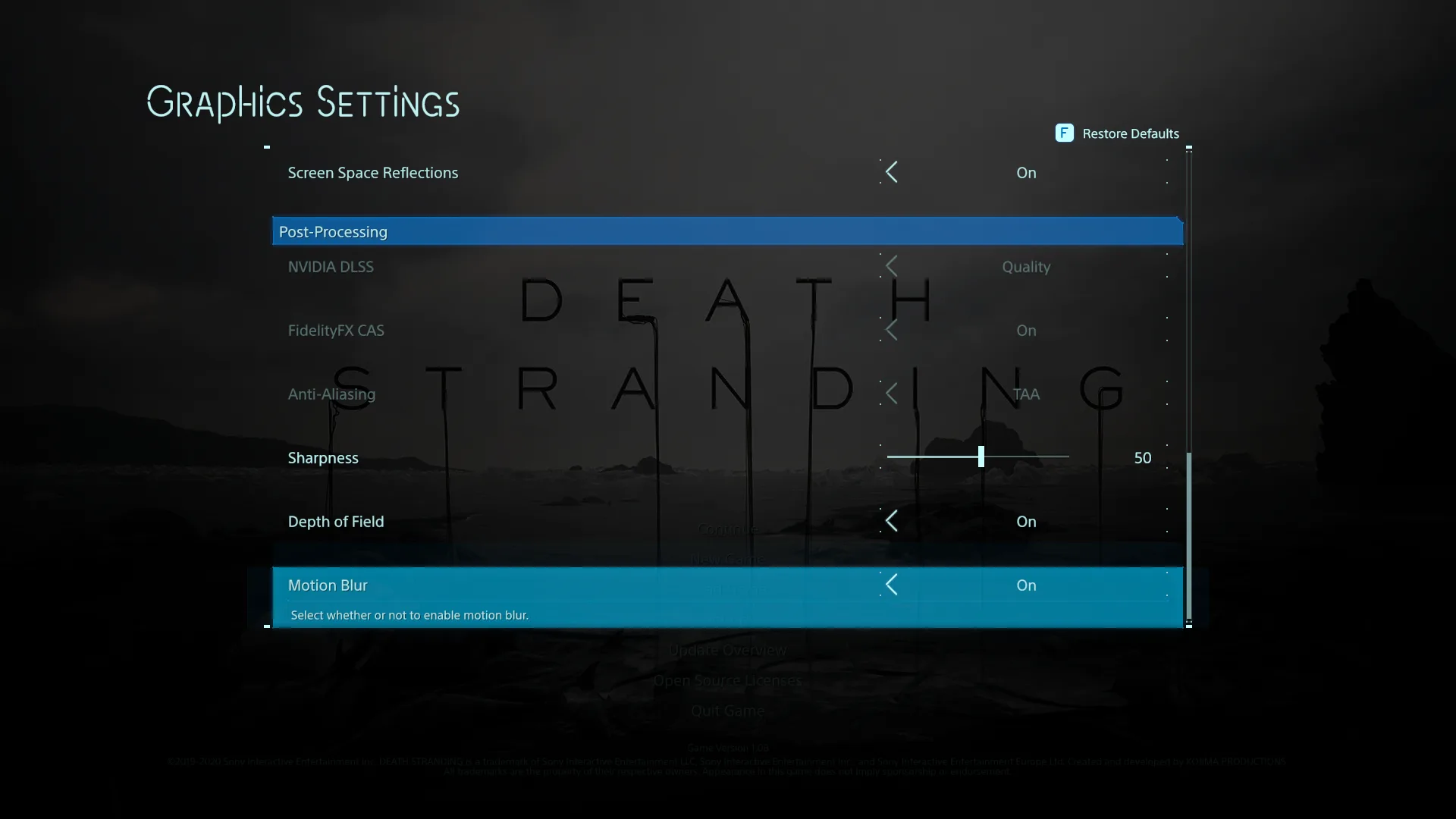 While DLSS/FSR is a great tech, they both can be responsible for crashing with DXGI Error Device Hung error message. The DLSS/FSR feature in Death Stranding is inside the graphics settings option. Turn DLSS/FSR off, restart your game. Many with RTX 4070/4080/5090 report stable 60+ FPS at high/very high settings + RT after disabling it.