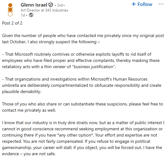 Israel, who left the studio in October 2025, frames his allegations under Washington state’s Revised Code of Washington (RCW) Title 49 protections, suggesting potential whistleblower implications. He claims the misconduct happened between January 2024 and June 2025, escalating after he filed formal complaints with Microsoft HR.