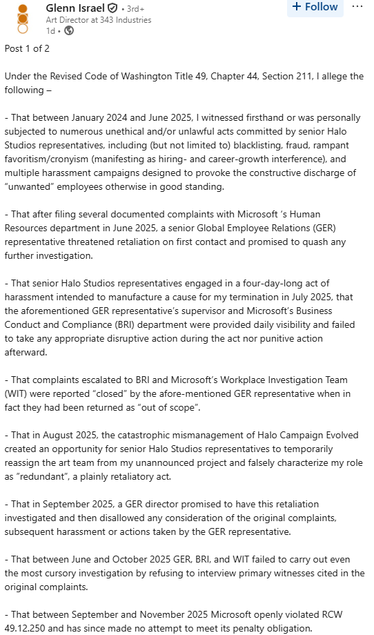 In a bombshell two-part LinkedIn post published April 3–4, 2026, veteran Halo developer Glenn Israel a 17-year industry mainstay who served as Art Director on major titles including Halo 3: ODST, Halo: Reach, and Halo Infinite, has publicly accused senior leadership at Halo Studios (formerly 343 Industries) and parent company Microsoft of blacklisting, fraud, and multiple harassment campaigns aimed at forcing out “unwanted” employees.