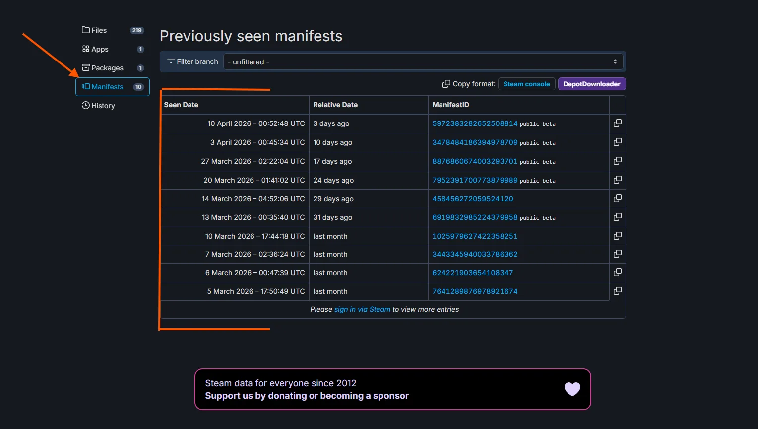 Click on the depot ID that matches your platform then click on Manifests. Copy the manifest ID for the build you want and open the Steam Console. SteamDB gives you the opention to open Steam Console right there from the Manifests tab. It is on the top right next to “Depot Downloader” button.