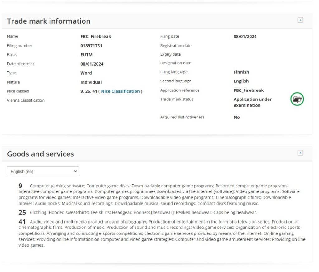 The filing, dated January 8, 2024, covers a range of goods and services, from computer gaming software to multimedia production. The inclusion of both downloadable and recorded game programs, as well as music and video production, hints at a large-scale project with potential multimedia tie-ins. This could suggest that “FBC: Firebreak” may be more than just a game—it could extend into other media formats, perhaps even a television series or cinematic films.